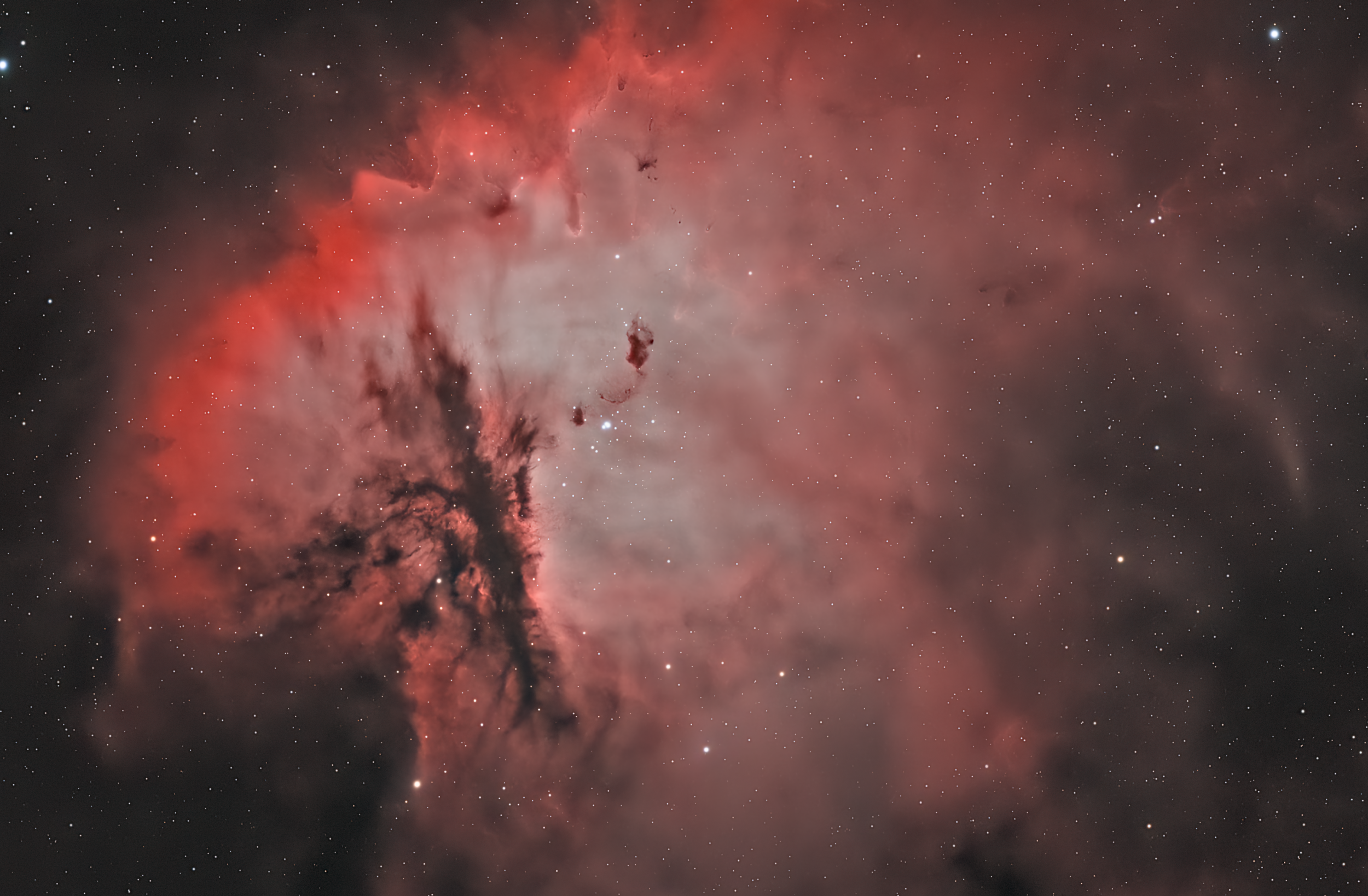 IC 1590 is an open cluster located in the nebulosity of NGC 281. 279 stars with magnitudes less than or equal to 17 are visible within or near the cluster. The cluster is estimated to be 3.5 million years old,[1] making it relatively young compared to other star systems. Inside the cluster is a multiple-star system that emits light which helps give the dust in NGC 281 its glow.[2